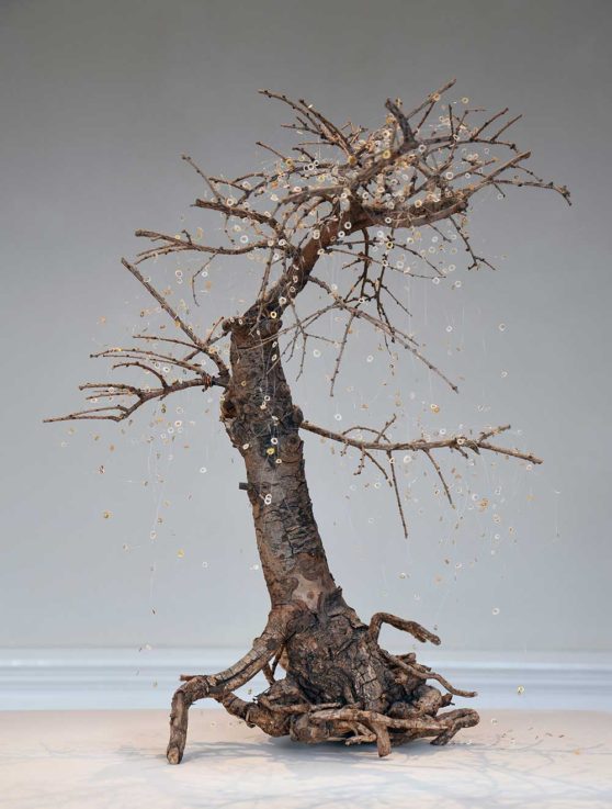Nature crafted, its value diminished through death, raised again through re-attention and the binding of its limbs in embroidery thread. Unceremoniously removed from its pot on its death this bonsai is both bound and unbound. Interests in site are revealed further by drawings created entirely through the blowing of ink across paper, which serve as a unique example of how humans interact with the environment. The dark expressive marks born from the dark recesses of our corporeal body echo the tree roots and branches in the bonsais they sit alongside.